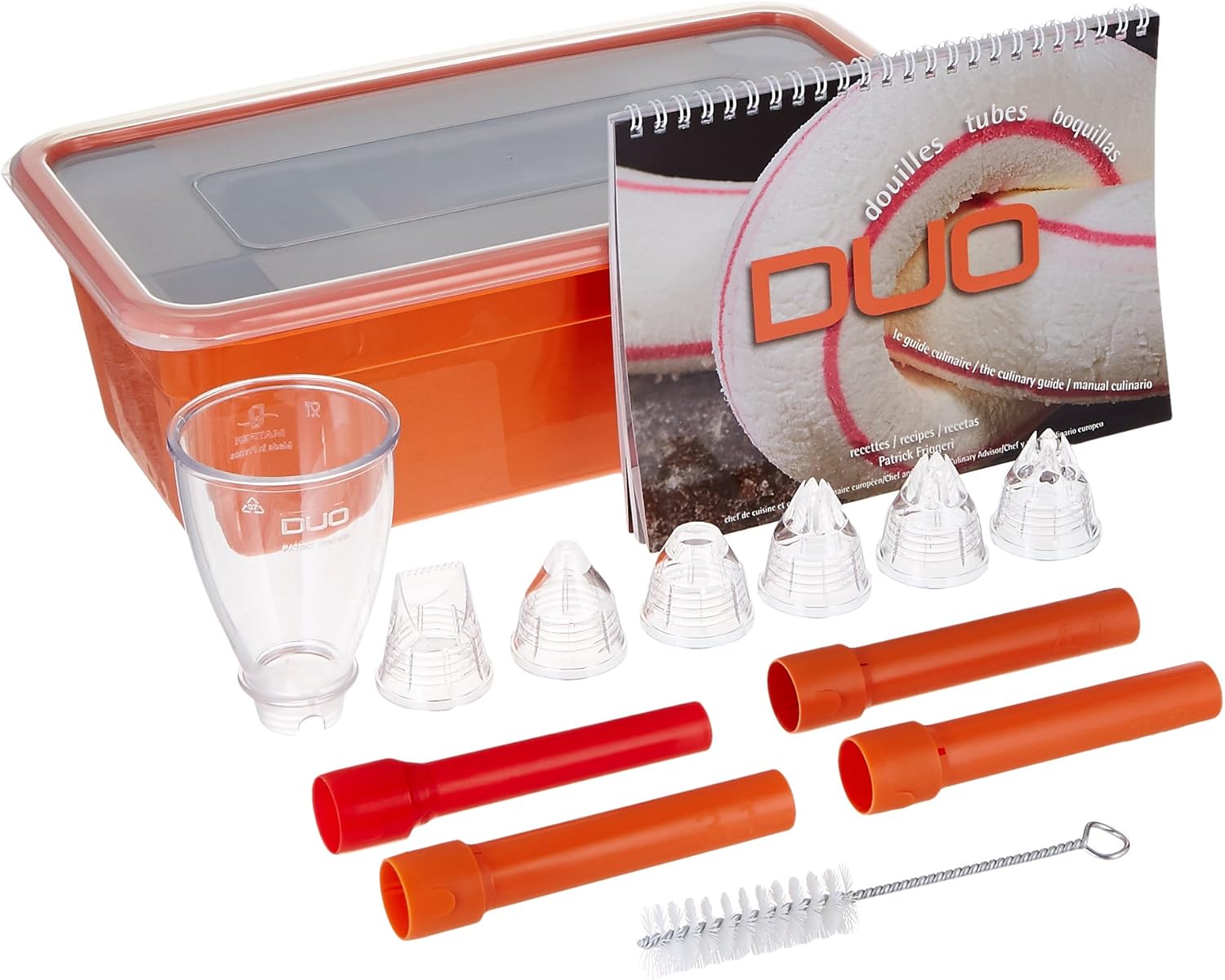 Coffre Duo de douilles Matfer Une gamme de couleurs et de saveurs pour inspirer les pâtissiers et cuisiniers. Des résultats exceptionnels. Facile à assembler, propre, fourni dans une boîte avec un livre de recettes. Marque: Matfer Dimensions: Taille de la boîte : 97(h) x 330(l) x 170(p)mm. Facile à monter, démonter et nettoyer Contient 1 x cone, 2 x tubes avec 3 rainures de 1 ou 2mm, 1 x tube avec 4 bandes et 1 x tube pour enrober, 6 x douilles à visser sur les tubes de décoration (ordinaire, étoiles, bûche de noël), 1 brosse à douille. 4 livres de cuisine assortis (en anglais).
